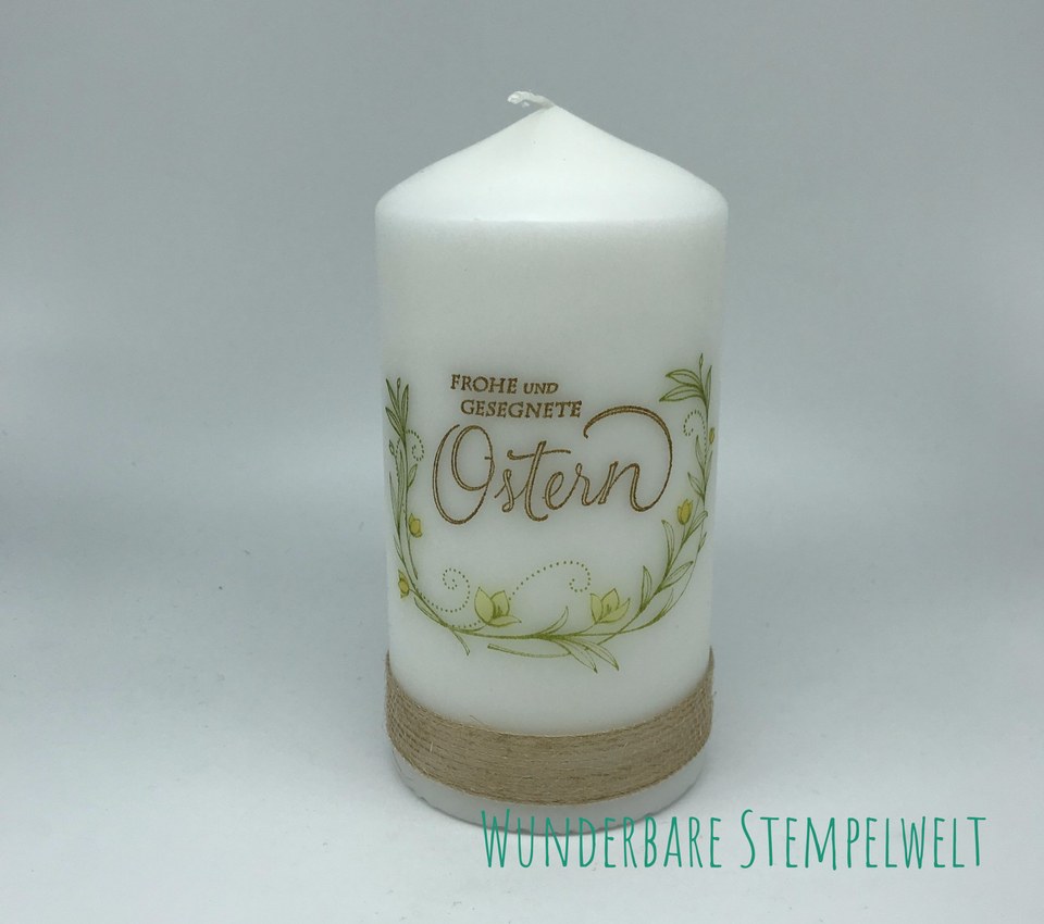 Osterkerze 155 x 77 cm; Stempelset Gesegnete Ostern, Stempelfarben Olivgrün, Wildleder und Savanne, Stampin' Blends in Savanne und Osterglocke, 5/8'' Juteband