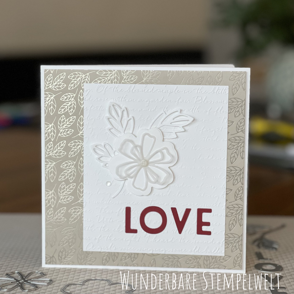 Darüber ein Blatt 14 x 14 cm aus dem Designerpapier Für immer im Herzen.